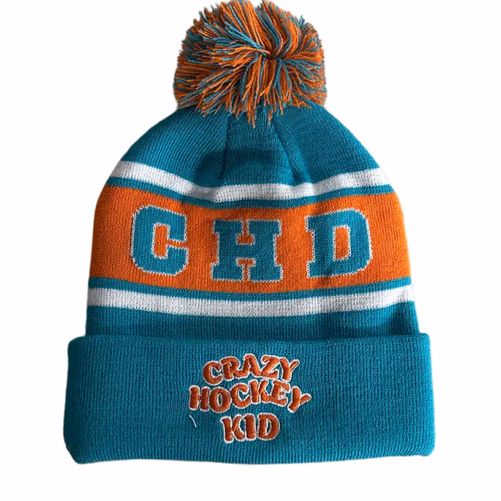 Crazy Hockey Kid lue er en flerfarget lue med dusk og er perfekt for kalde vinterdager. Crazy Hockey Kid er brodert foran på lua.